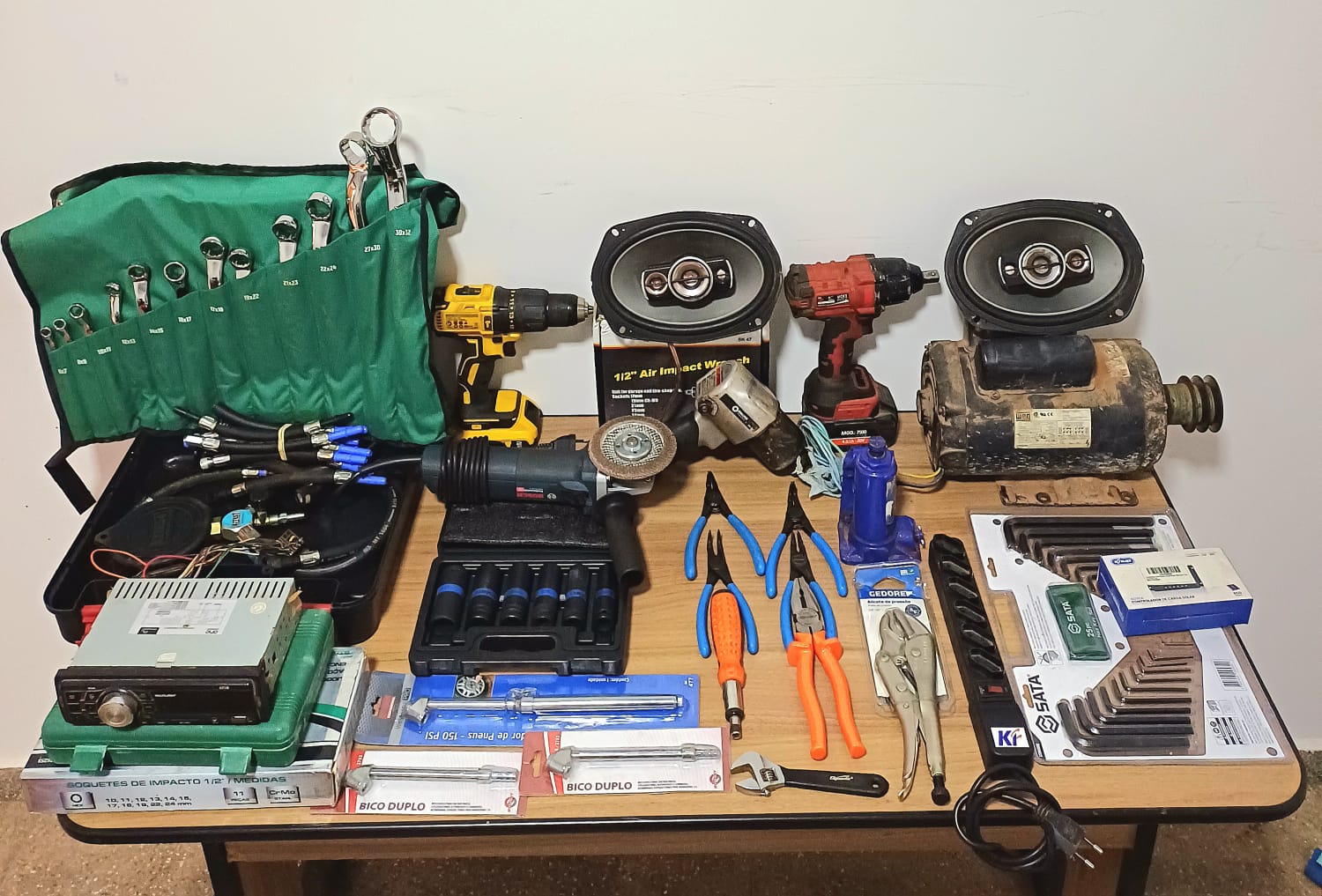 Foram recuperados vários materiais, como: parafusadeiras; maleta contendo seis soquetes; um macaco de capacidade para duas toneladas; bolsa contendo jogo de doze chaves utilizadas em oficina mecânica; filtro de linha; maleta contendo kit teste de pressão de bomba de combustível com treze mangueiras e relógio marcador; lixadeira; alicates; entre outros objetos.