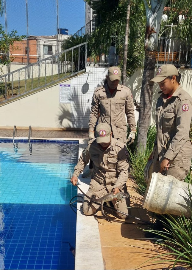 O Corpo de Bombeiros Militar de Mato Grosso (CBMMT) realizou, neste domingo (21.07), o resgate de uma iguana que estava em uma piscina de um condomínio no bairro Duque de Caxias II, em Cuiabá.