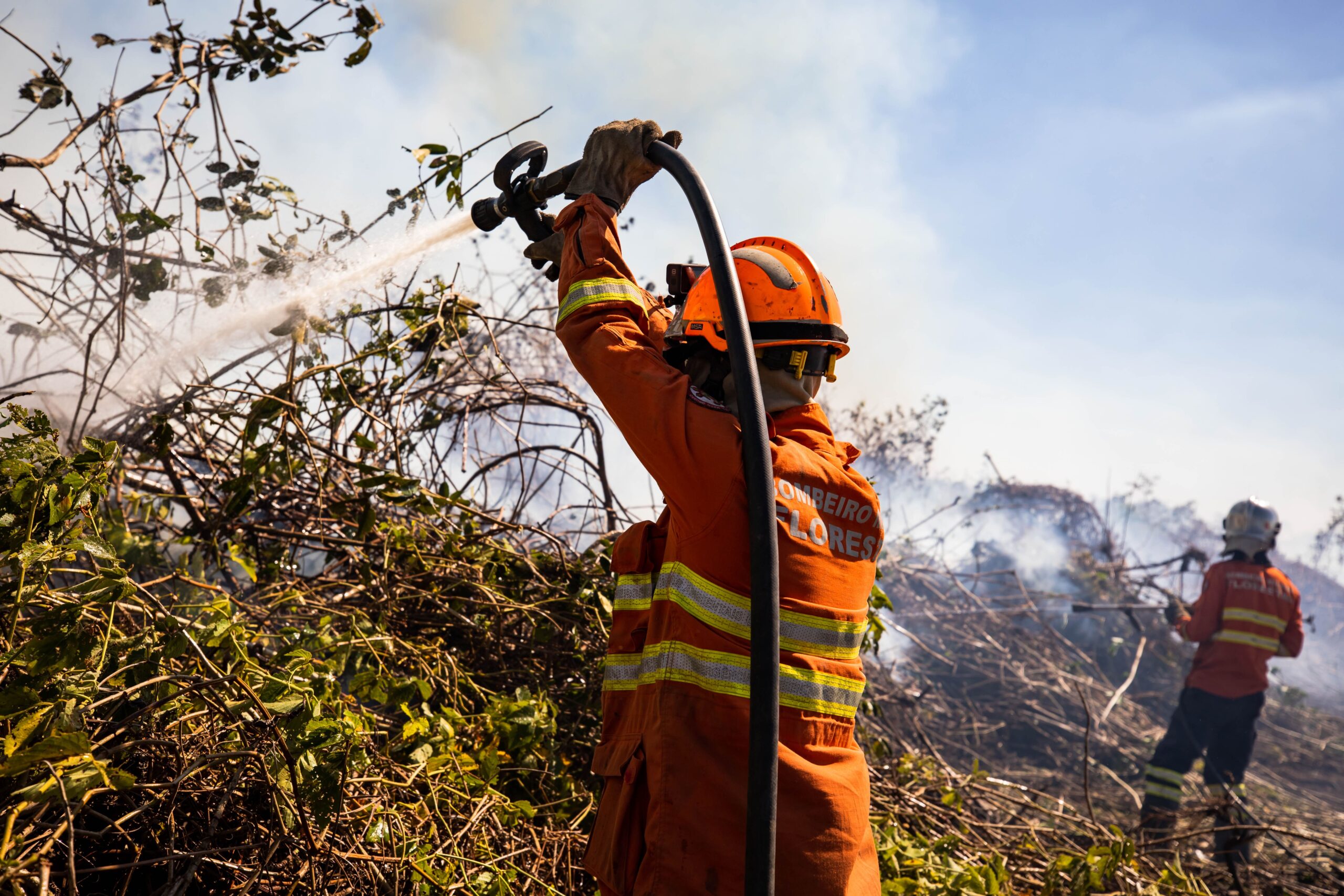Dentro do Parque Nacional do Pantanal Mato-grossense (Parna Pantanal), brigadistas do ICMBio e do Ibama combatem um incêndio próximo à divisa da Reserva Particular do Patrimônio Natural Estância Dorochê.