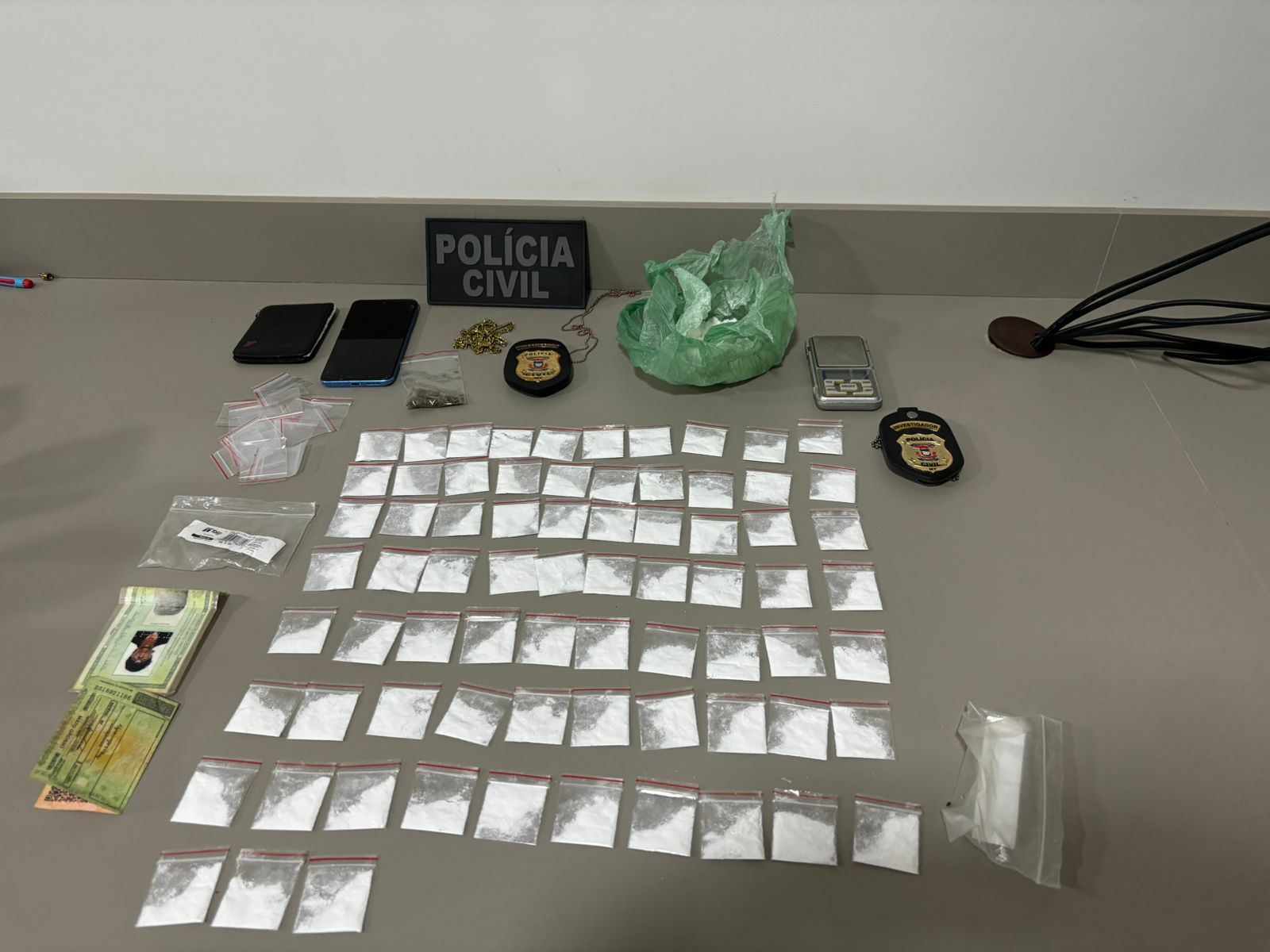 No total, foram apreendidas no local 73 porções de cocaína já embaladas para venda, uma porção grande da droga, além de diversos apetrechos relacionados ao tráfico. Diante dos fatos, os suspeitos foram conduzidos à delegacia onde após serem interrogados, pelo delegado Alexandre Segreto, foram autuados em flagrante.