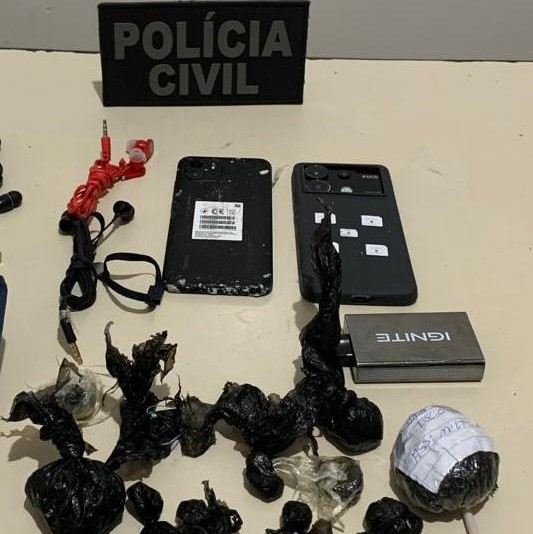 Durante a busca e apreensão, foram localizados aparelhos celulares, chips de telefone, diversas porções de entorpecentes, anotações do tráfico e provas de crimes de estelionato.