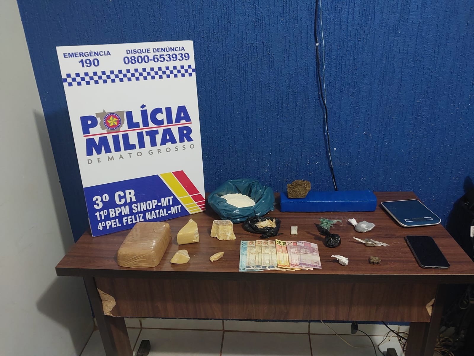 Policiais militares do município de Feliz Natal prenderam um homem por tráfico de drogas na tarde desta sexta-feira (20.09). O suspeito, de 19 anos, se apresentou como membro de uma facção criminosa. Com ele, foram apreendidos tabletes e porções de entorpecentes como maconha, cocaína e pasta base de cocaína.