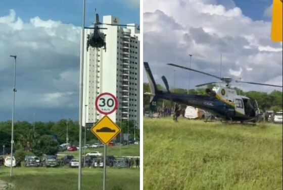 é possível ver o momento em que um dos helicópteros do Centro Integrado de Operações Aéreas (Ciopaer) pousa na rotatória, em uma das vias mais movimentadas da Capital.