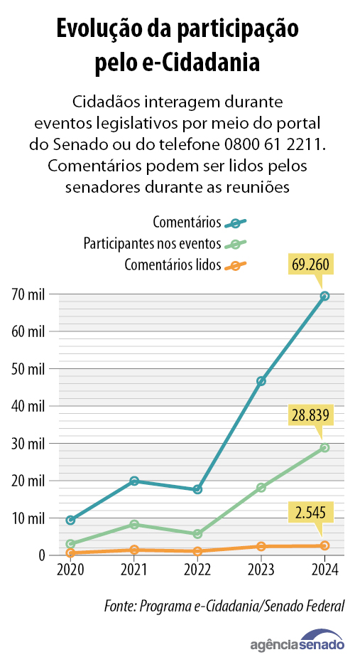 O Portal e-Cidadania — uma das principais interfaces de comunicação entre o Senado e os cidadãos — atingiu em 2024 recorde de participação popular em eventos interativos: em relação ao ano anterior, houve aumento de quase 50% nos comentários (que incluem perguntas) e de 58,9% no número de participantes.