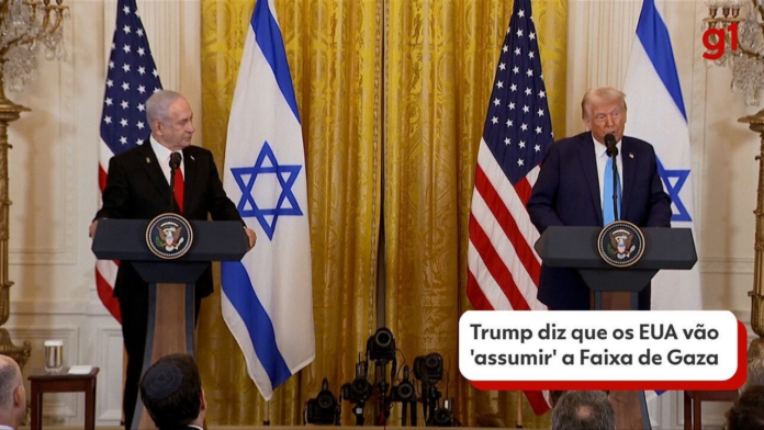 A bordo do avião presidencial, presidente americano também disse que está aberto à possibilidade de permitir a entrada de alguns refugiados palestinos nos EUA, mas que consideraria tais solicitações caso a caso. Ao lado de Netanyahu, Trump diz que os EUA vão ‘assumir’ a Faixa de Gaza