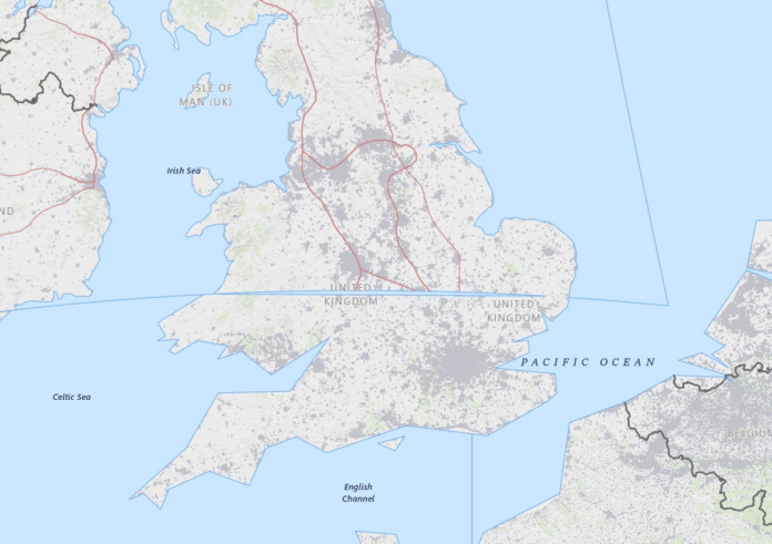 Outro erro detectado está no Reino Unido, que aparece com o território praticamente dividido ao meio por uma faixa de água.