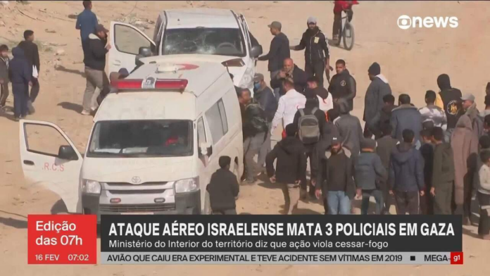 Um ataque aéreo israelense matou três policiais a leste de Rafah, no sul da Faixa de Gaza, neste domingo. As informações foram dadas pelo Ministério do Interior do grupo terrorista Hamas, que chamou o ataque de violação do frágil cessar-fogo de 19 de janeiro.