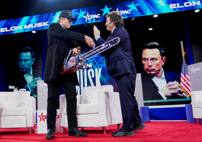 “Chegou a motosserra à DOGE…!!!”, escreveu Milei na rede social X, referindo-se a uma comissão de corte de gastos públicos federais (Department of Government Efficiency, na sigla em inglês), criada por Trump e liderada por Musk.
