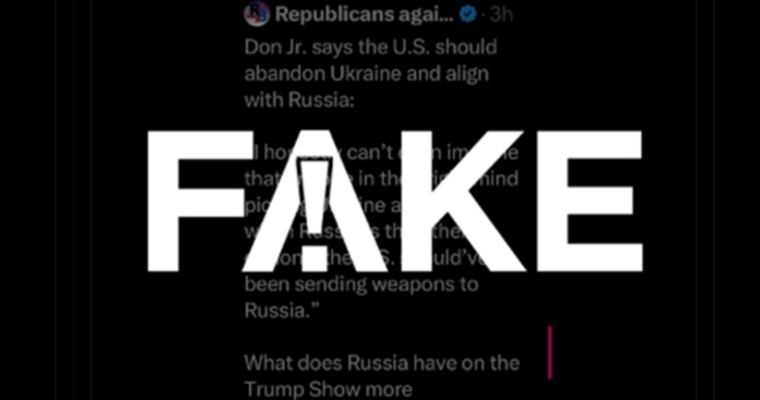 “Nós deletamos um vídeo que estava circulando nas redes sociais, supostamente mostrando Don Jr. dizendo que os EUA deveriam ter se aliado e armado a Rússia em vez da Ucrânia, assim que descobrimos que era falso — gerado por IA. Don Jr. já fez muitos comentários horríveis sobre a Ucrânia e o presidente Zelensky no passado, é por isso que muitos acreditaram que ele realmente tenha dito isso”.