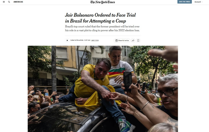 O jornal “The New York Times” entitula que “Jair Bolsonaro é condenado a enfrentar julgamento no Brasil por tentativa de golpe”.