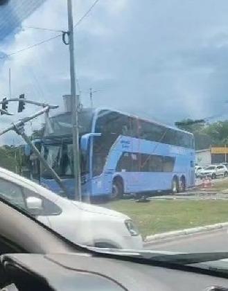 Um ônibus de uma empresa de viagens acertou um poste em uma rotatória, da Avenida Fernando Corrêa da Costa, próximo ao entroncamento com a Avenida Beira Rio, em Cuiabá, na tarde desta quarta-feira (26).