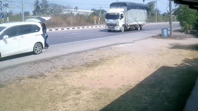 Homem que estava no conta que não se feriu, mas pensou que poderia perder a família. Motorista teve ferimentos leves. Mãe e menino escapam por pouco de serem atingidos por carro em estrada na Tailândia