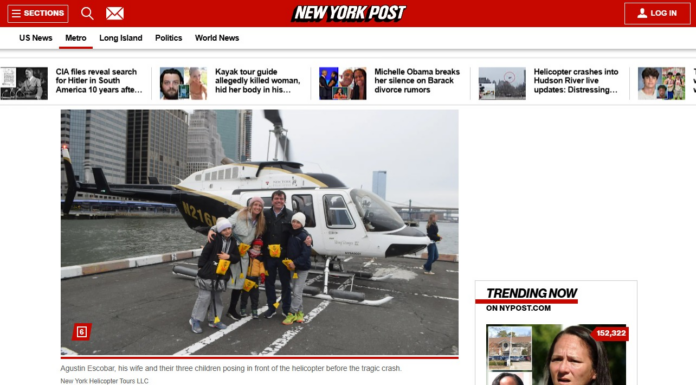 As imagens, divulgadas pelo jornal The New York Post, tiveram a autenticidade confirmada pelo g1 após serem encontradas em registros recuperados pela ferramenta “Wayback Machine”. O acidente que ocorreu nesta quinta (10) deixou seis vítimas – o executivo da Siemens Agustín Escobar, a esposa dele, os três filhos e o piloto. Família que morreu no acidente de helicóptero em Nova York fez registro antes do passeio