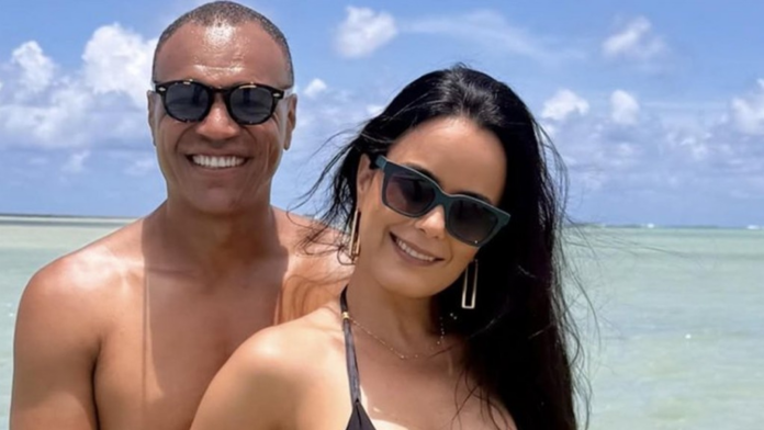 Luciele Di Camargo e Denílson, ambos de 47 anos, estão completando 15 anos de casados nesta sexta-feira (30). Para celebrar a data, eles tiraram um momento a dois para curtir em uma praia.