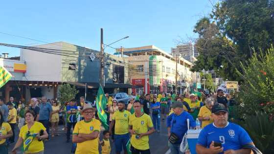 Com bandeira dos Estados Unidos da América (EUA) e toalha com a imagem do ex-presidente Bolsonaro (PL), manifestantes se reúnem na tarde deste domingo (7), em Cuiabá, para mais uma manifestação nacional a favor da anistia. O protesto acontece na Praça 8 de Abril, em frente ao restaurante Choppão.