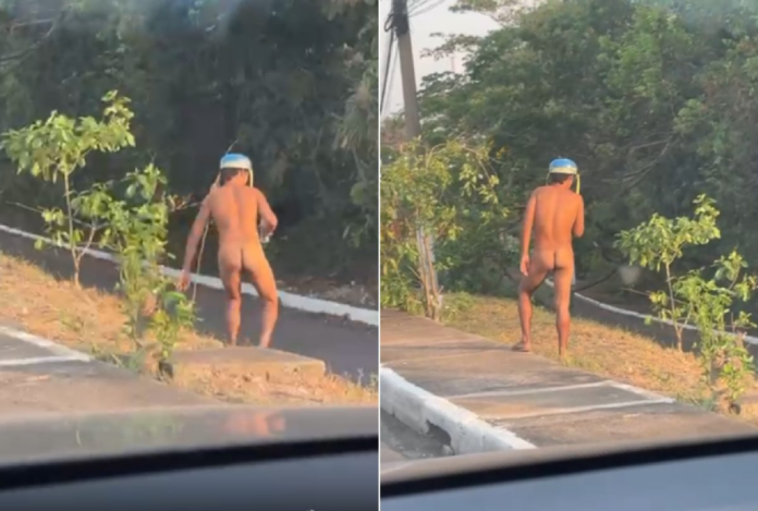 No registro, o motorista comenta: “O cara andando nuzinho aqui na Fernando Corrêa, olha aí! Olha a folga dele, meu Jesus do céu. Esse é folgado!”