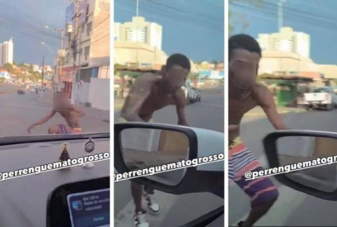 O motorista tenta desviar dele, mas o homem insiste em tentar se jogar na direção do carro. Quando o condutor do veículo consegue se desvencilhar dele, o homem ainda chega a correr atrás do carro.