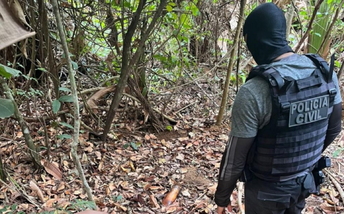 A equipe da Polícia Civil acionou reforço da Força Tática da Polícia Militar e foi até o local apontado pelo suspeito, uma região de mata de difícil acesso, onde o corpo da vítima foi encontrado enterrado.