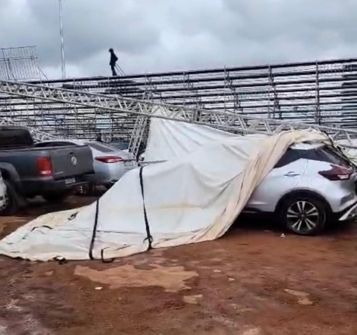 A forte chuva que caiu na noite dessa quinta-feira (13), no Parque Novo Mato Grosso, em Cuiabá, derrubou a cobertura da arquibancada montada para a Stock Car e danificou 30 veículos estacionados no local (Veja o vídeo no final).