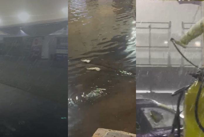 teve acesso mostram a força da chuva atingindo a região do autódromo, onde muitas pessoas buscavam abrigo no restaurante e áreas cobertas.