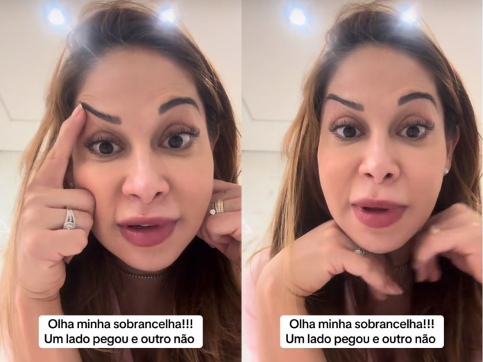 “Gente, saca minha sobrancelha! Olha que coisa ridícula. (…) Eu já liguei para a moça e falei: ‘Pelo amor do Senhor, um lado pegou e o outro não’. Aqui tá levantando, só essa sobrancelha aqui e aqui levanta curvada, olha que palhaçada”, contou.