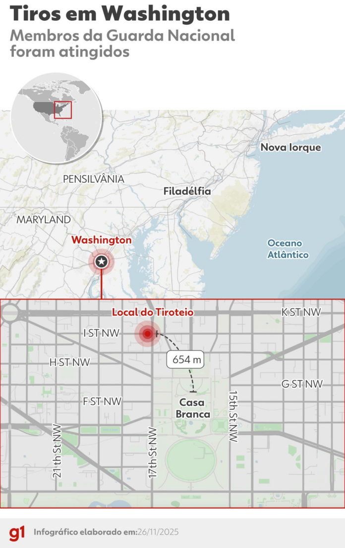 Dois integrantes da Guarda Nacional foram baleados e socorridos em estado grave após um ataque nesta quarta-feira (26) perto da Casa Branca, em Washington, D.C.