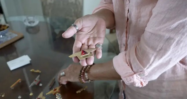 Sobre sua mesa da sala de estar, ela abre suas “asas”, os distintivos que levam seu nome e que ela costumava inserir na lapela do uniforme, quando prestava serviços aos passageiros.