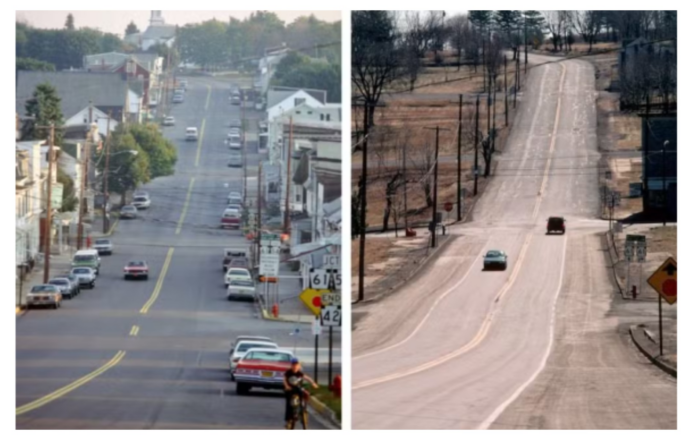 Tudo começou a mudar em 1962. O fogo, iniciado para “limpar” a área antes das homenagens do Memorial Day — comemorado sempre na última segunda-feira de maio —, por si só não seria capaz de causar um desastre. Mas havia uma mina de carvão abandonada abaixo do lixão, que foi atingida pelas chamas. Isso foi o suficiente para deflagrar um desastre subterrâneo jamais controlado.