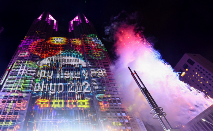 Pessoas reagem após a contagem regressiva para o Ano Novo em frente ao prédio do Governo Metropolitano de Tóquio