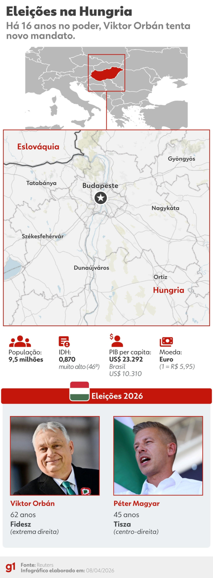 Orbán, líder do partido Fidesz e um dos principais nomes da direita nacionalista na Europa, vê sua legenda ficar com 57 cadeiras no cenário atual, enquanto o Mi Hazánk teria 7 assentos, de acordo com o órgão eleitoral nacional (NVI).