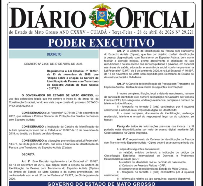 O Governo de Mato Grosso publicou o Decreto nº 2.006/2026, que regulamenta a Lei Estadual nº 10.997/2019 — de autoria do Deputado Sebastião Rezende — trazendo definições práticas e operacionais para a emissão da Carteira de Identificação da Pessoa com Transtorno do Espectro Autista (CIPTEA). A medida transforma a lei em um instrumento efetivo de política pública, detalhando como o direito será aplicado no dia a dia.